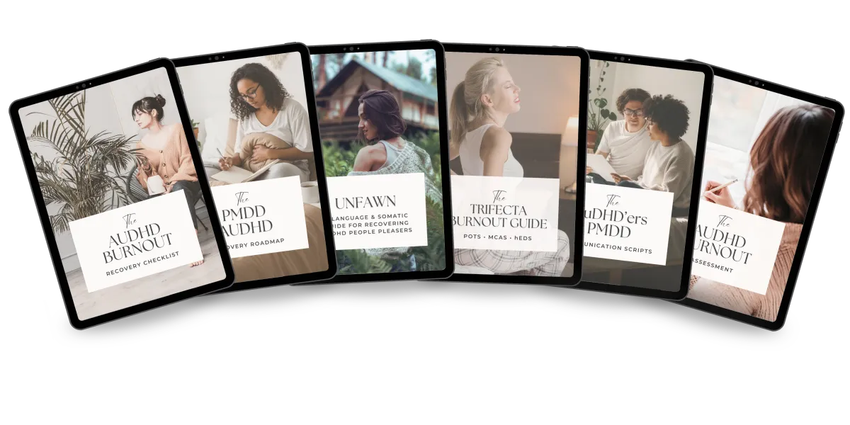 These guides address the most common reasons AuDHD burnout recovery fails—and you get all of them for free. Most burnout advice misses hormonal cycles, medical issues, and boundary work. We don't.